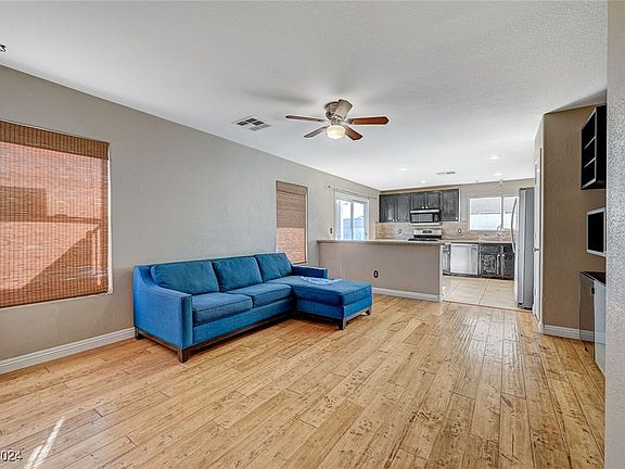 This charming 3-bedroom, 1.5-bathroom, two-story home offers a spacious, open floor plan with plenty of natural light. The updated kitchen features beautiful granite countertops, ample cabinet space, stainless steel appliances, perfect for everyday living and entertaining. Upstairs, you'll find three comfortable bedrooms with generous closet space, freshly painted, plus a full bathroom with stylish fixtures, dual sink, extra storage space and luxury shower. A convenient half-bath is located on the main floor for guests with updated fixtures. The home boasts a mix of hardwood flooring, laminate, and tile throughout, providing durability and style. The low-maintenance backyard is ideal for outdoor relaxation. Located in a vibrant Las Vegas neighborhood, this home is close to shopping, dining, schools, and major roads for easy commuting. Additional features include 1 car garage, lots of storage and guest parking and a rustic touches throughout. Under the stairs dog room with ventilation
