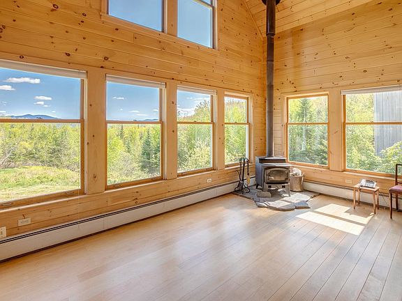 Ultimate escape in the White Mountains. This stunning contemporary home on 200 acres, sited in a meadow surrounded by ridges and ravines, offers absolute privacy. Yet, it is only 10 to 15 minutes to big box stores, quaint shops, fine dining, the regional hospital and award winning Littleton. Skiing, hiking, snowshoeing and snowmobiling abound. Sweeping mountain views from Mt. Moosilauke all the way to Mt. Lafayette fill the windows. Sited SSE for ultimate solar gain and with all the amenities of a fine home, this completely "Off Grid" property is your own private self-sufficient world. Walls of windows make you feel as if you are in a treehouse in the midst of nature. Wooden beams accentuate cathedral ceilings throughout. Spread over 4 floors including lofts and the daylight workshop there is lots of sleeping, sitting and office space. The main floor bedroom has a spa bathroom and a loft bed space with phenomenal views. Striking floor to ceiling ‘Rumford’ fireplace constructed with stone from the property anchors the living/gathering room which has amazing light from multiple sides. Off the living room is a covered porch at tree top level. 'Upper level' bedroom and bath are tucked away with an adjacent indoor deck to soak in the views. The expansive office/guest room continues the theme of ample light. The screened sleeping porch is perfect for those warm summer nights, listening to the stream below. The dining room wood stove keeps you cozy. Bonus 30X96 greenhouse on site.