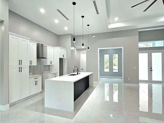 The interior features a bright, open floor plan with high ceilings and stylish finishes throughout. The kitchen includes quartz countertops, stainless steel appliances, and a large island, making it ideal for cooking and entertaining.