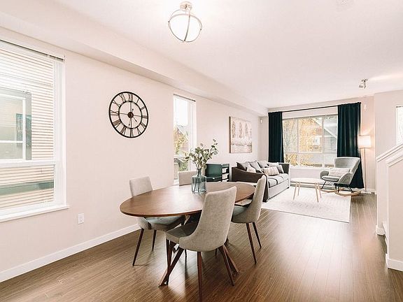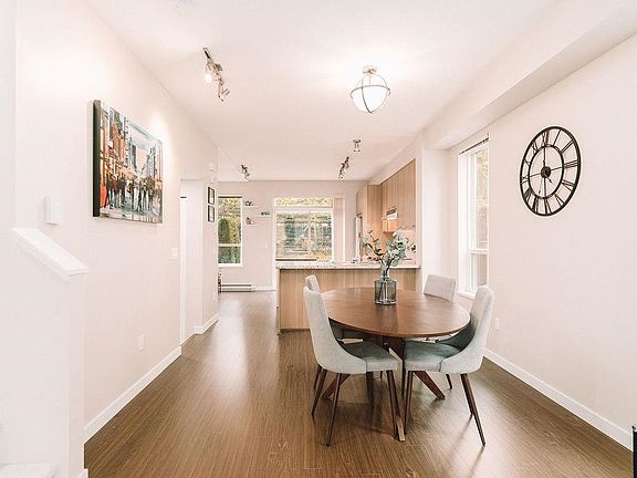 STUNNING CORNER UNIT TOWNHOUSE IN BURKE MOUNTAIN. Meticulously maintained while looking like a show home. 3 bed, 2 bath Townhouse w/ fantastic open floor plan & 1375sf. Main showcases a beautiful kitchen w/quartz counters, Stainless Steel appliances w/ tons of storage & room for eating. Large patio & yard off the main is ideal for entertaining, pets & watching the kids play. Large dining area fits a big table & living room showcases a feature wall w/ an electric fireplace & built in shelves for extra storage. 3 good sized beds up including a stunning main bed w/ a walk in closet & ensuite. The BEST up & coming area of Burke Mountain being only moments walk to Riley Park & the master planned neighbourhood of Burke Mountain Village.