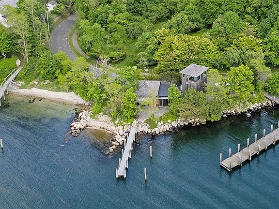 Newly remodeled 1,513 sq ft, 2-bedroom waterfront home with private dock and beach. Situated on Silver Eel Cove of Fishers Island's coveted west end, the unique house features a 3-story tower that rises above the main living space. The 2 bedrooms are located on the first and second floors of the tower. Ascend to the third for stunning water views of Connecticut and Fishers Island Sound. This elevated space is perfect as a dedicated office/studio and includes a wet bar for entertaining, or can be your own private sanctuary to relax and get away from it all. The main space is designed for comfort and connection, featuring a large living area with a cozy fireplace and built in shelves to hold your favorite books. The well-equipped open kitchen/dining area is perfect for entertaining family and friends. The abundance of natural lighting and rich textures create a spacious and serene atmosphere with exposed painted brick complimented by warm wood floors and walls. Step out one of the glass sliders onto the expansive 852 Sq ft. stone patio - where you can enjoy outdoor living in your own private oasis. Surrounded by nature, this prime 2-lot property is framed by mature trees and shrubs with a private deep-water dock that is ideal for boating, fishing, or simply basking in the tranquility of the island. The included private beach lot is located just beyond the Navy boat ramp for added sunbathing, swimming and other water activities.
