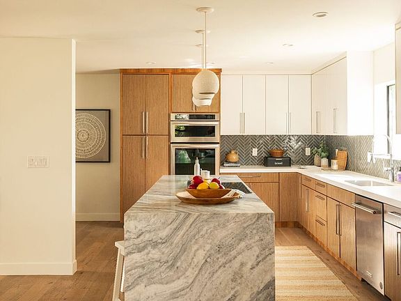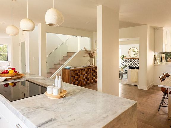 In the heart of Mar Vista, moments from Santa Monica's coastline, the Beethoven Market, and the vibrant dining of Venice Boulevard and Abbot Kinney, this modern architectural home captures the ease and sophistication of coastal California living. The open floor plan connects a sunken family room with tiled fireplace, a second living area, a formal dining space, and a wet bar with wine fridge. The gourmet kitchen, anchored by a marble island and stainless steel appliances, is ideal for both daily living and entertaining. Upstairs, the primary suite offers high ceilings, a spa-like bathroom, walk-in closet, and private balcony with ocean views. A second ensuite bedroom, two storage closets, and a laundry closet complete the level. Crowning the home is a spacious rooftop deck showcasing panoramic ocean and marina views, an ideal setting for sunset gatherings. The backyard is a private oasis with a fire pit, outdoor shower, and chef's kitchen with BBQ and fridge. Exterior stairs lead to an upper terrace with a 25' x 25' saltwater infinity pool, spa, and dining deck surrounded by lush greenery. Completing the property is a versatile two-car garage that can easily function as a pool room, creative studio, or home office, enhancing the home's adaptability to any lifestyle.
