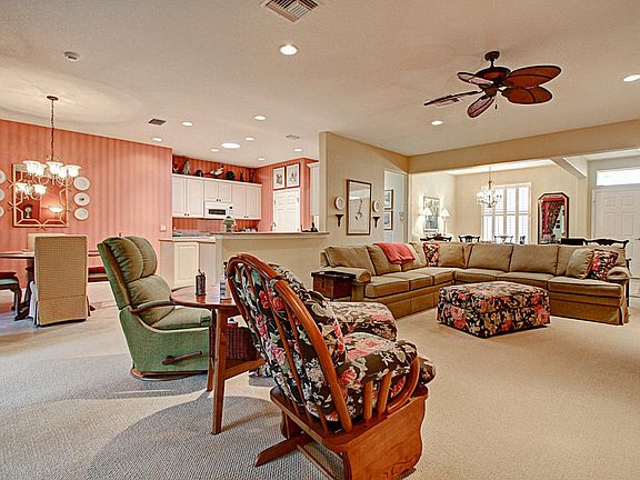 BEAUTIFUL UPGRADED HOME IN DEL WEBB SPRUCE CREEK GOLF & COUNTRY CLUB. Professionally decorated 3/2 plus den on picturesque deep tree-lined back yard - very private. Upgraded flooring and cabinets and plantation shutters throughout. Square footage includes Florida room under heat & air and portion of lanai is screened. HVAC new in 2012 and was moved to the garage. HVAC has air purifier and there is a dehumidifier in garage. Great room curtains convey but bedroom curtains do not convey. Never had any pets in house. Monthly HOA includes guard, common are maintenance, trash removal and use of all the amenities. Please be sure to view the new 3-D tour of this home.