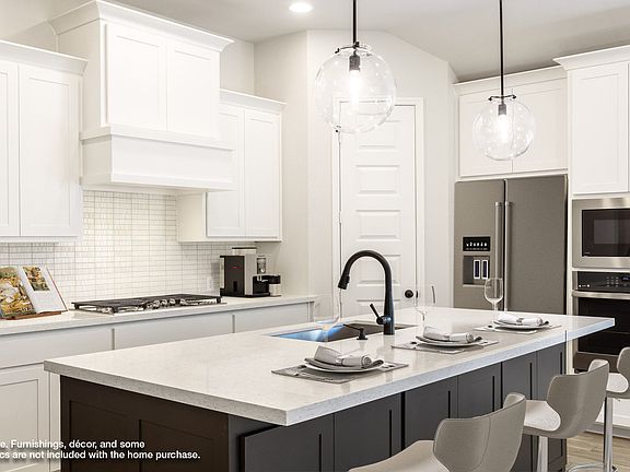 Entry with 13-foot ceilings framed by a game room and home office both with French doors. Extended entry flows to the kitchen and dining area. Island kitchen with built-in seating space, 5-burner gas cooktop and a corner walk-in pantry. Family room with a wall of windows. Secluded primary suite. Primary bath offers dual vanities, garden tub, separate glass enclosed shower and two walk-in closets. Guest suite with a full bathroom and a walk-in closet. Secondary bedrooms and a utility room complete this one-story design. Covered backyard patio. Mud room just off the two-car garage. Representative Images. Features and specifications may vary by community.