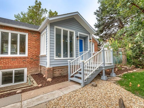 Beautifully updated 4 bedroom, 2 bathroom, ranch plan home with a brand-new roof on both the house and detached studio, fresh exterior paint, new LVP, carpet, paint, lighting, fixtures, and hardware throughout. Great curb appeal with mature trees and a fenced yard, directly across from a trailhead. Step inside through the enclosed sunroom into a spacious living room with wood-burning brick fireplace, built-ins, and large accent window. The kitchen has all-new stainless appliances, quartz counters, subway tile backsplash, modern soft-close cabinetry, pantry, and eat-in space with views to the backyard. Two main-level bedrooms each feature walk-in closets, and the updated full bath offers a quartz vanity, tiled tub/shower, and built-in storage. The basement adds two more bedrooms with egress windows, a family room with electric fireplace, laundry room, ample storage, and a stylish bath with tiled walk-in shower. Enjoy the outdoors on the enclosed back porch with skylights, huge concrete patio, pergola, stone pathways, and mature landscaping. The detached studio is perfect for a home office, gym, or creative space—complete with vaulted ceilings, LVP flooring, electric heat, and separate power. Additional upgrades include a tankless water heater, hot water baseboard heating, new fencing with gated access, and remote-control ceiling fans. Move-in ready with modern finishes and versatile living spaces inside and out!