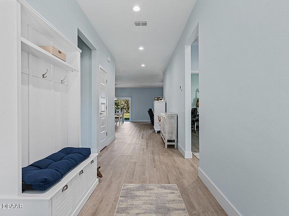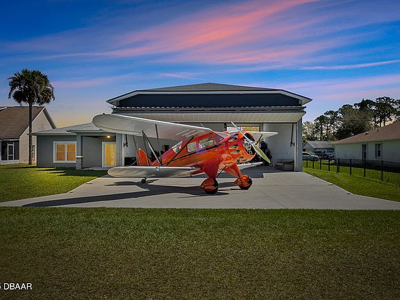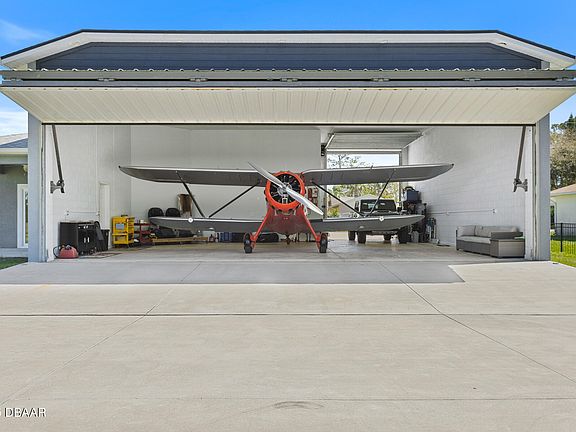 Welcome to Massey Ranch Airpark, a coastal fly-in community that includes a paved and lighted runway measuring 4360 feet. This impressive semi-custom hangar residence was completed in 2023. The sellers incorporated enhanced finishing details during the build, including cabinets, interior doors, hardware, trim, lighting, tailored wood closet shelving, appliances, Pompei quartz countertops throughout, a wider driveway, electric ambiance shades, plantation shutters and much more. The dimensions of the hangar are 39. 4 feet in width (with an opening of 38 feet), a depth of 31. 8 feet, and a ceiling height of 15. 4 feet, which features a Schweiss bifold door. The hangar also includes an RV parking space, equipped with a garage door that opens 12 feet wide and has a height of 14 feet, making it the perfect versatile hangar. The owner, who is also a pilot, has kept as many as three aircraft inside the hangar. If you need to leave quickly, there is no need to stress because this house is just 1600' from the runway, allowing for a quick taxi time of less than 2 minutes to your next journey or work site! This charming airport community is genuinely unique. Few airport communities are found on the east coast of Florida in close proximity to Orlando.