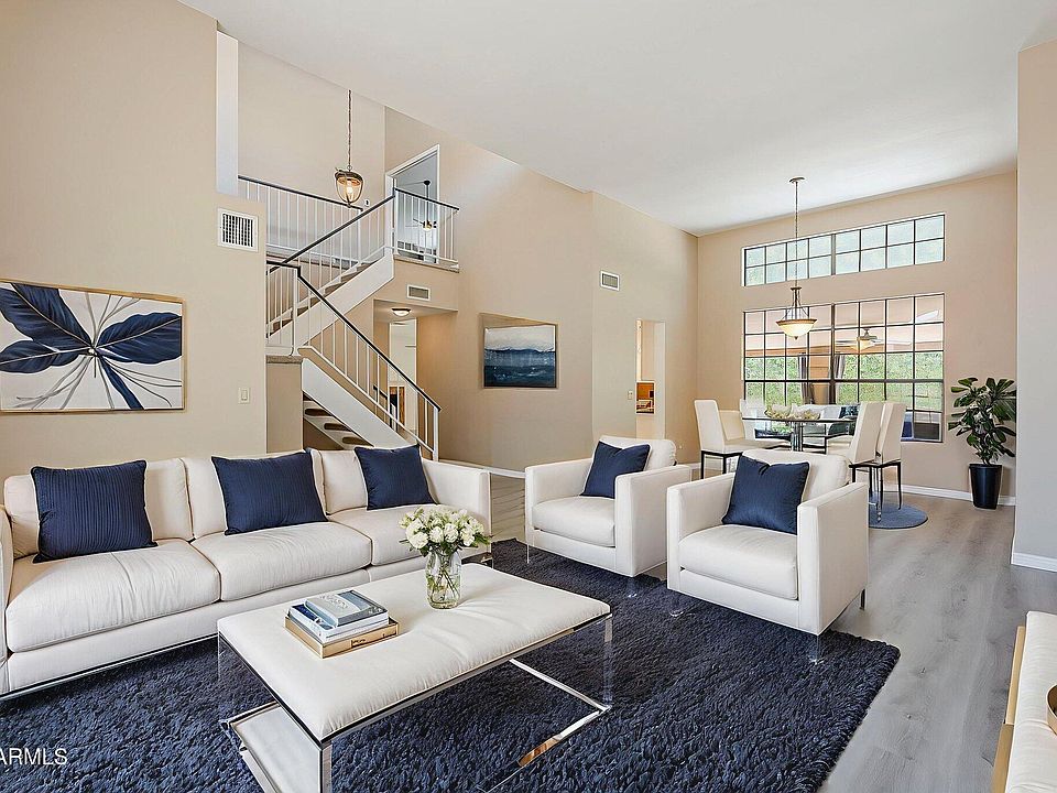 Welcome to a home where comfort meets convenience in one of Scottsdale's most desirable neighborhoods. This 4-bedroom, 3-bathroom residence offers 2,490 square feet of well-designed living space, perfect for both quiet nights and lively gatherings. Step inside to find brand-new flooring throughout the ground level, adding fresh appeal to the open-concept layout. Living room and dining areas with high flat ceilings. The kitchen features recently refinished cabinets, providing a clean, modern touch that's ready for your culinary adventures. Plenty of storage space, a breakfast bar, all stainless-steel appliances included. Breakfast nook for morning gatherings at the table. Great room with a built-in fireplace and sliding door exit out to the covered patio area. Large bedroom downstairs with double the closet space. A full-size bathroom and ample laundry space round out the main level of the home. Take the stairs up to the spacious primary bedroom offers a peaceful retreat, complete with vaulted ceilings, your own built-in fireplace, and generous closet space. Master en-suite bath with dual vanities, soaking tub and walk-in shower. Two additional guest rooms on the upper level along with another full-size bathroom. Outside, escape into your own private sanctuary. The backyard is lush with mature landscaping, a grassy area for play or pets, and a newer above-ground hot tub that beckons after a long day. Prefer a swim? There's a private pool, ideal for enjoying those warm Arizona afternoons. Solar panels help with energy efficiency and aligning with a more sustainable lifestyle. The property is nestled in a highly sought-after community, where peaceful streets and well-kept surroundings are the norm rather than the exception. Plenty of parking space with a 3-car garage and built-in cabinetry. Nature and culture lovers alike can explore nearby Camelot Farms Park or visit Taliesin West, just minutes away. Located near top-notch schools, like Camelback Desert School and The Goddard School. For quick commutes or weekend getaways, the Loop 101 and Scottsdale Airpark is conveniently close by. Whether you're looking to host weekend guests or just stretch out and enjoy the space, this home offers all the right touches to relax and recharge - without forgetting the fun. Come see what makes this residence not just a house, but a home.