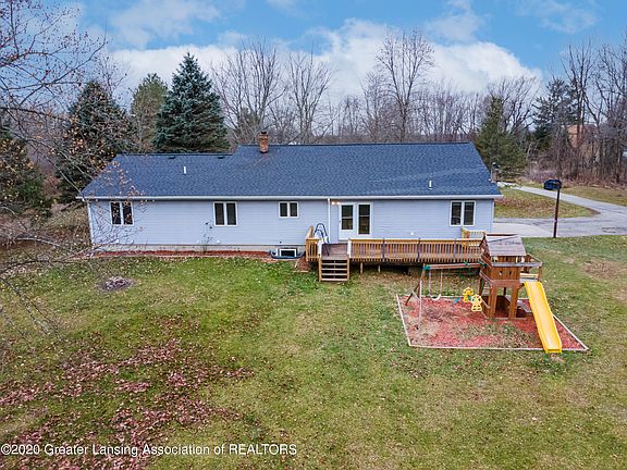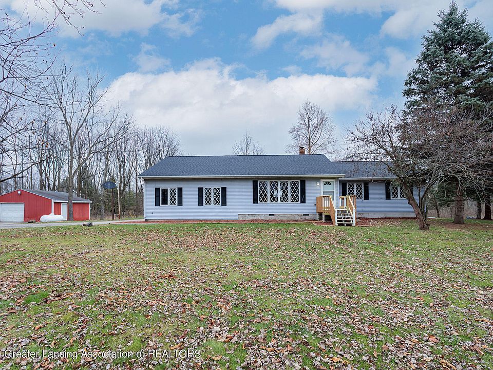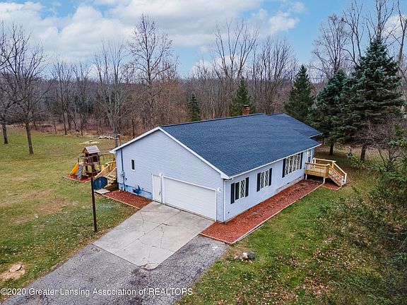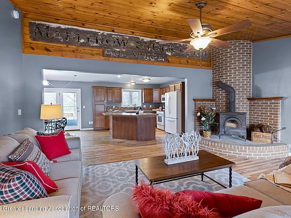 What a Find! 5 bedroom house with 2.5 Baths, first floor laundry, washer and dryer remain. Large mud room for coats , boots and dog bowls. All on 4+ Acres. You'll love the vaulted tounge and grove ceiling in the expansive living room. 4 bedrooms on the main floor with an Owners en suite bath. The kitchen has loads of counter space and an island area with seating. The wood stove in the corner of the living room heats the whole house! Live without a mask! , This is a perfect place to plant aGarden, Raise Chickens, goats, whatever! A two car attached garage, and a Pole barn. Lots of potential in the unfinished lower level with tall ceilings and exit to the back yard! All appliances included.