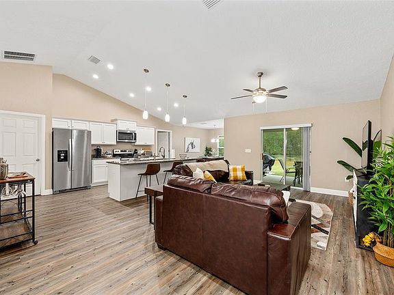 Bring your toothbrush and settle right into this stunning, fully furnished home, perfectly nestled on a sprawling one-acre lot. This nearly new residence—lived in for less than a year—offers the feel of a brand-new build with all the comfort and charm of a thoughtfully designed home. With 3 spacious bedrooms, 2 elegant bathrooms, and a versatile office or den, this property effortlessly blends style and functionality. Step inside to soaring vaulted ceilings and an open-concept living space that welcomes you with natural light and warmth. The galley kitchen is a true showpiece, featuring soft-close cabinetry, granite countertops, stainless steel appliances, and a large breakfast bar—perfect for casual dining or entertaining guests. The luxurious primary suite is a private retreat, highlighted by a beautiful tray ceiling and a spa-inspired bathroom with granite counters, soaking tub, walk-in shower, and a private water closet. Each space throughout the home has been carefully crafted to offer both beauty and comfort. Step outside to your own private sanctuary. A covered patio overlooks the expansive backyard and serene wooded area beyond—ideal for relaxing mornings or evening gatherings. The property is cross-fenced to keep your furry friends safe while they roam freely. Completing the picture is a massive 32' x 20' attached garage with dual doors—ideal for vehicles, storage, or even a workshop. Located on a paved road just minutes from the heart of Ocala, this home offers convenient access to local events, shopping, dining, and the best the area has to offer
