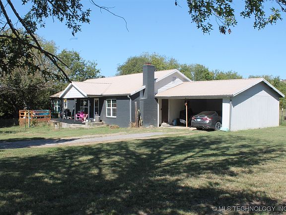 Small pondBarn and lean-toFormal dining roomWood burning fireplaceMature treesMetal roofCovered patio