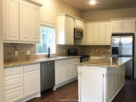 Spacious 4 bed / 4 bath home in Eastgate, walking distance to Texas A&M campus. High ceilings and large windows bring in natural light , open living room and kitchen with tall cabinets, large island, granite countertops, & stainless steel appliances. Each bedroom has a bathroom and large closet. The two upstairs bedrooms have high vaulted ceilings . The front yard is shaded with large mature trees, and the entire backside of the house has a covered porch for the huge fenced-in backyard. Hardwood in the common areas, carpet in the bedrooms, and the bathrooms are tiled.
