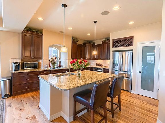 This home features a main floor primary bedroom with ensuite bathroom, with amazing views and fireplace! On the main floor, you'll also find a 2nd bedroom, an office, laundry room, mud room, updated chef's kitchen, living room and a covered deck with expansive views of the mountains!!