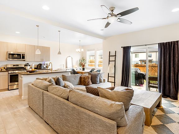 The open layout of the living area creates a seamless flow from the living room to the dining area and kitchen. The modern kitchen is equipped with ample counter space and a breakfast bar, making it a chef's dream. Large windows and a sliding glass door provide plenty of natural light, creating a warm and inviting ambiance.