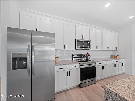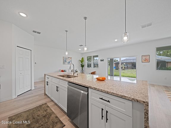 COMPLETED NEW CONSTRUCTION IN PALM BAY- This 4 bedroom 3 bath home exudes Florida living and charm. The anchor and primary living area of the home is sprawling, holding the living room, dining room and custom kitchen. A noteworthy aesthetic and design, the kitchen holds sleek white shaker style cabinets that pair perfectly with an oversized kitchen island with a waterfall edge. A true entertainer's delight, this area of the home contains access to the spacious backyard via the covered patio space, which is perfect for cookouts and more with its blend of indoor/outdoor living. Back inside you will find the spacious 4 bedrooms featuring two primary suites with private ensuites containing quartz surround showers and dual sink vanities. The home has many upgrades including custom tiled shower walls, accent walls, LED lighting, high ceilings and much more! Close to Patrick Space Force Base, beach and river access, and more, schedule your tour today!