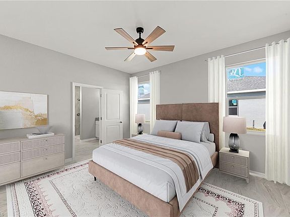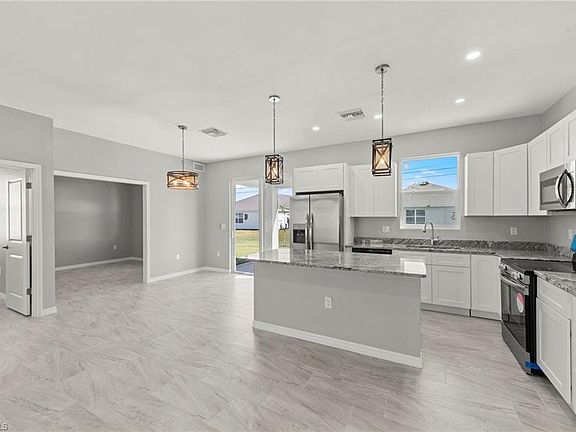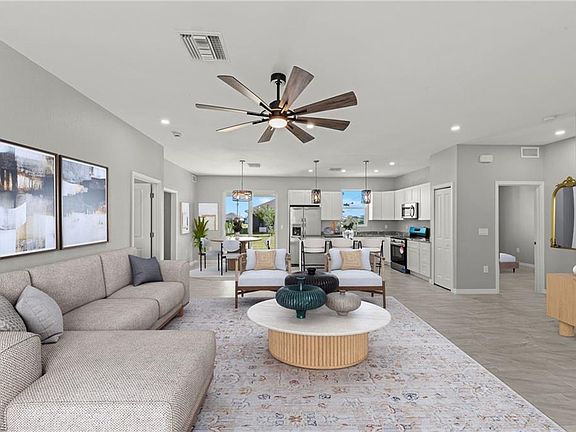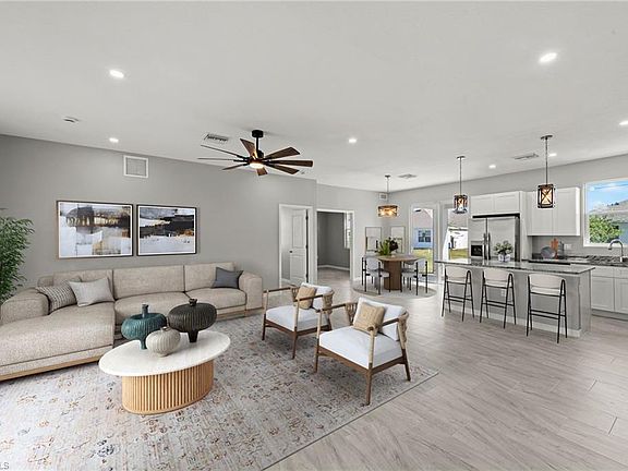 Step into modern Florida living with this brand-new Cape Coral home that hits all the marks. This 3 bedroom plus Den, 2 bathroom residence delivers a clean, contemporary feel the moment you walk through the door. The great room opens up with volume ceilings and seamless tile flooring throughout, giving the entire home a bright and spacious flow. The kitchen is the showpiece. A massive quartz island, sleek cabinetry, and a full pantry make it the perfect setup for everyday living and effortless entertaining. The private owner’s suite sits tucked away and offers the comfort buyers expect today with large walk-in closets, dual vanities, and a beautifully finished walk-in shower. You’ll also appreciate the peace-of-mind features: hurricane impact windows and doors, a two car garage with a paved driveway, and a covered lanai overlooking a backyard that easily accommodates a future pool, playground, or fenced retreat. This property isn’t in a flood zone, comes with no HOA or CDD fees, and includes a one year home warranty at closing. Completion is right around the corner with the CO expected in under 30 days. Several rooms have been virtually staged to help buyers visualize the space. The location puts you minutes from Palmetto Pines Country Club, Coral Oaks Golf Course, Target, Publix, Starbucks, shopping, dining, and everything the Cape has to offer. If you’re looking for a worry free, move in ready option in one of Southwest Florida’s fastest growing cities, this one delivers.