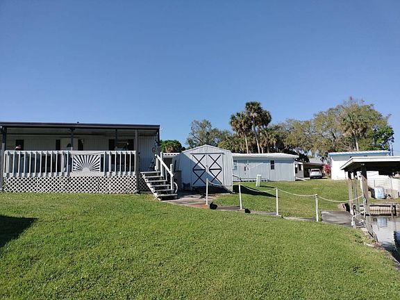 SPACIOUS HOME ON LARGE LOT WITH DECK AND BOAT LIFT! DIRECT ACCESS TO TAYLOR CREEK! Welcome to River Bend a peaceful well maintained 55+ community! This home is a 2 bed 1.5 bath 864 sq.ft in the heart of Okeechobee. Lot rent is $370 per month and includes 1500 gallons of water, trash and sewer. The home comes equipped with a boat lift and large wooden deck to overlook gorgeous water view. There is a large shed onsite that includes a GOLF CART! There is also a large screened in porch on the west side of the home with central air conditioning. The split floor plan is great for when guests come to visit. The spare boasts a half bath and spacious closet. Most furniture is included with sale including all kitchen appliances and washer and dryer. Do not let this home pass you by. Seller is motivated! LAKE OKEECHOBEE IS A PREMIER FISHING DESTINATION IN FLORIDA! BOAT RAMP LOCATED IN COMMUNITY! River Bend is situated directly on the Taylor Creek. Boat or drive to Lake Okeechobee in minutes! Only minutes away from all major shopping needs - Aldi, Home Depot, Winn-Dixie, Walmart and more! Want to go to the beach? Okeechobee is just 45 minutes from Fort Pierce Inlet State Park. All listing information is deemed reliable but not guaranteed and should be independently verified through personal inspection by appropriate professionals. Our company does not and cannot guarantee or warrant the accuracy of this information or condition of this property. Measurements are approximate. The buyer assumes full responsibility for obtaining all current rates of lot rent, fees, and pass-on costs. Additionally, the buyer is responsible for obtaining all rules, regulations, pet policies, etc., associated with the community, park, or home from the community/park manager. Our company is not responsible for quoting said fees or policies.