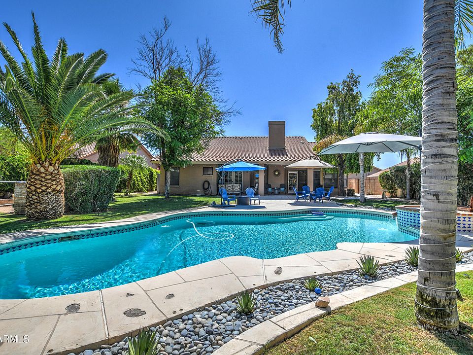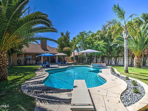 Need your own private oasis? Look no further! This beautifully maintained home in the desirable Sweetwater Ranch neighborhood of Scottsdale sits on a spacious 10,000+ square foot lot & offers a peaceful backyard retreat with a sparkling diving pool and mature landscaping—ideal for relaxation and entertaining. The home features 3 comfortable bedrooms & 2 full bathrooms. The updated kitchen includes glass-front cabinetry, newer refrigerator & dishwasher, & an inviting eat-in area with views of the lush, green yard. Enjoy the open great room with vaulted ceilings & cozy fireplace, along with a separate formal dining area offering flexibility for everyday living & gatherings. A two-car garage and easy-care front landscaping complete the package. Cool deck & patio just completely resurfaced!! Located close to parks, shopping, dining, and other amenities, this Sweetwater Ranch gem offers the perfect balance of comfort, privacy, and convenience.
