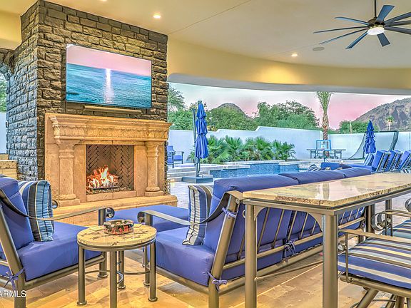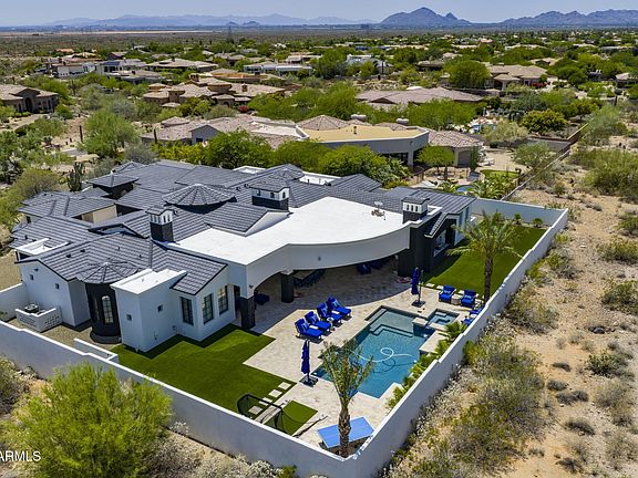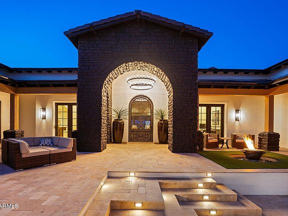 Behind a private gated entry driveway on quiet cul-de-sac this no-HOA spectacular estate has been fully transformed, offering opportunity to own a designer-finished home inside and out that lives like new. This property features more than $1.1 million in recent upgrades, including private travertine outdoor living with water/fire feature, 6 outdoor sound systems, 12-foot backyard walls sculpted to maximize privacy & mountain views, pool/spa, turf & hardscape, huge covered patio, multiple TVs, surround sound, fireplaces, and outdoor kitchen. A designer home w/ full chef's kitchen, soaring architectural ceilings, rotundas, curated finishes, sanctuary primary suite w/ 2 sitting areas, dual-sided fireplace, 2 generous walk-in closets, dual water closets, and a spa-caliber bath w/ sauna & gym. This property truly is architectural brilliance meeting turnkey luxury in a Scottsdale Mountain view estate. This spectacular estate has been fully transformed, offering the rare opportunity to own a fully designer-finished home and outdoor living spaces. Set against a breathtaking 360° backdrop of rugged mountain peaks and brilliant desert skies, this is where timeless design meets effortless resort living. This property features a newly refinished travertine courtyard with its own full-size gated entry, a fireplace, a unique water/fire feature and a full outdoor sound system. The courtyard leads to a dramatic arched entry, where a custom over-sized iron door opens into interiors defined by soaring beamed and barrel ceilings, two rotundas, rich textures, and curated finishes. A Restoration Hardware-featured fireplace anchors the formal living room, setting the tone for spaces that are as architectural as they are welcoming. At the heart of the home, a custom chef's kitchen stuns with dual marble-topped islands, glazed cabinetry, a mother-of-pearl backsplash, and top-of-the-line Wolf, and Sub-Zero appliances, w/ a separate bar and wine room in the family room. Whether hosting a crowd or cooking solo, every detail is designed to elevate the everyday. The primary suite is a sanctuary of scale and serenity. Enjoy a private sitting area, dual-sided fireplace, two generous walk-in closets, dual water closets, and a spa-caliber bath complete with sauna and fitness room. Each guest suite offers its own luxe ensuite bath and walk-in closet, while the detached casitaw/ kitchenette, full bath, and walk-in closetwelcomes guests or extended family with style and privacy. Modern luxury is woven into every corner: an upgraded Savant smart home system integrates lighting, sound, HVAC and AV throughout. Ten ultra-thin Sony 4K TVs, Sonos soundbars, architectural speakers throughout the entire house and exterior, and a newly upgraded 8K projector in the custom home theater deliver an immersive entertainment experience. A commercial-grade Cox Gigabit hardwired WI-FI internet system ensures seamless connectivity. The resort-caliber backyard feels like a private retreat, complete w/ a newly resurfaced Pebble Tec pool and spa, brand-new turf and hardscape, a dramatic outdoor fireplace, and a newly outfitted kitchen with built-in grillall set beneath a covered travertine patio with new ceiling fans and a surround sound TV system. Major enhancements include a complete reimagination of the entire outdoor area of this 1-acre estate, enlarged car parking area, new gated driveway with connected walls for privacy and security, all-new exterior and interior paint, a new concrete tile roof with a 15-year warranty and all new flat roof w/ 12-year warranty, and five new HVAC systems, EV charging outlet in the garage, updated Savant system, new speakers and sound bars throughout, new theater AV equipment, newly imagined family room built-ins and fireplace, with updated lighting, cabinetry and countertops throughout. From sweeping views to sophisticated details, every inch of this property has been elevated. This is more than a homeit's a design-forward lifestyle and a rare opportunity to own one of the most refined and turnkey estates in the desert.