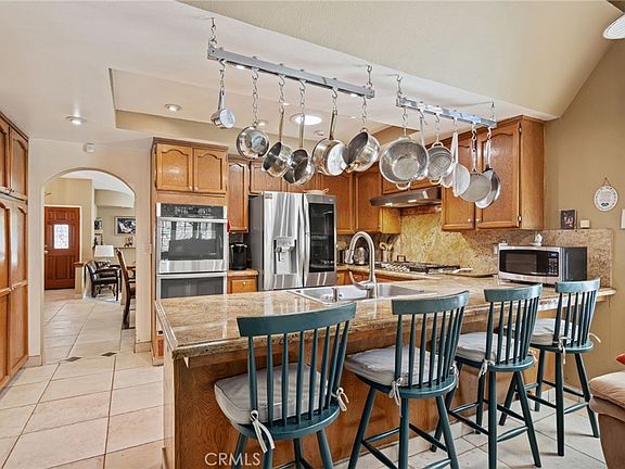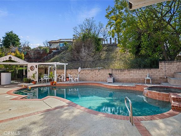 Nestled in the prestigious north of Rinaldi, west of Balboa area of Granada Hills, this rare single-story, privately gated home offers both luxury and convenience. Within walking distance to multiple scenic parks, this exquisite property boasts a spacious interior with vaulted ceilings, a step-down living room featuring a custom wet bar, elegant Travertine floors with corner accents, and a stunning marble fireplace. Newer windows and sliding doors bring in abundant natural light. The remodeled kitchen is a chef’s dream, showcasing slab granite counters and backsplash, a breakfast bar, and stainless steel appliances, including a double-door refrigerator with ice maker, cooktop, dishwasher, and double electric oven. The reimagined primary suite offers wood floors, a ceiling fan, and direct access to the backyard, while the remodeled ensuite bath features a frameless glass tile shower, new bidet, and dual sinks. The family room overlooking the kitchen adds additional space for guests to relax. The upgraded hall bath is enhanced with a new shower door, granite counter, and granite accent walls, and wood shutters adorn the windows throughout. Designed for entertaining, the expansive backyard features a sparkling, brick-trimmed pool and spa, a built-in barbecue center with sink, and lush landscaping with avocado and apple trees. A large covered patio provides the perfect space for outdoor gatherings. Recent upgrades include a new pool heater, motor, and pump, as well as leased solar panels for energy efficiency. This stunning home combines elegance, comfort, and an unbeatable location—don’t miss the opportunity to make it yours!