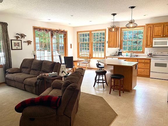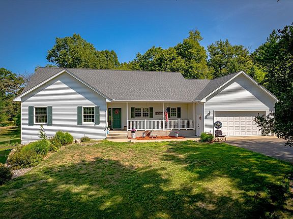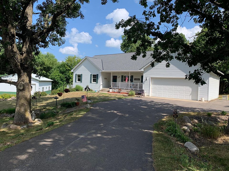 Private 5 acres with a 3 bedroom, 3 bath home with a walk out lower level. Open floor plan in the living room, kitchen and dining area with oversized patio doors. 2 sided fireplace that is open to both the living room and the primary suite. Primary suite has it's own private bath with a walk in shower and jetted tub. Main floor laundry with desk/work area just off the kitchen area. 3rd bedroom in the lower level with a huge family room/2nd kitchen area. With a deck, patio, and front porch, there is plenty of space for privacy while enjoying your time outdoors. Plenty of storage room in the 30 x 44 pole building with both a 10 x 10 overhead and a 13'8 x 14' sliding door. New shingles in 2023.