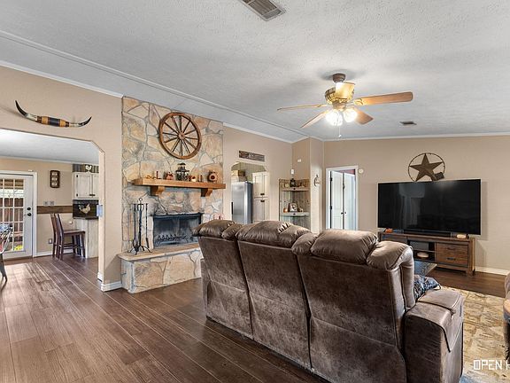Experience peaceful country living on 1.2 acres along a lightly traveled road shared by only a few neighbors. This 3 bed, 2 bath home offers an open kitchen-to-living layout, stainless appliances, island, and large windows for natural light. Isolated master suite with walk-in closet and spacious bath. Covered front & back porches overlook fenced yard, landscaped garden, and open pasture views. Updates include new water heater, appliances, and flooring. Features in-ground storm shelter and 3 horse stalls!