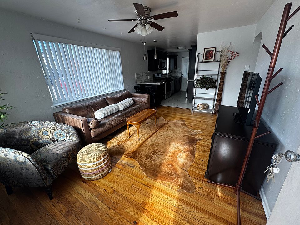 A short 2 minute walk to the light rail on Sheridan and 4 blocks from Sloans lake. 2 bedroom 1 bath Courtyard apartment. New paint throughout. End unit with the most light. Breakfast bar and modern appliances including dishwasher, microwave and gas range. Furniture can be included to make your move a breeze. No additional cost for furniture and can be an unfurnished apartment if that is the need. No neighbors above and only on one side. Quiet one story complex of 8 units total.