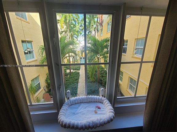 Cozy studio with impact windows, central AC and views of the beautifully maintained communal courtyard. The Habana Condominium is a well-run, clean and quiet. It features secured gated entry to the communal gardens and to the building, cameras, and a nice keyed laudry room. All of this just 2 blocks away from the beach!! It can be rented with the convenient storage bed or without. Owners prefer to rent it with the bed.