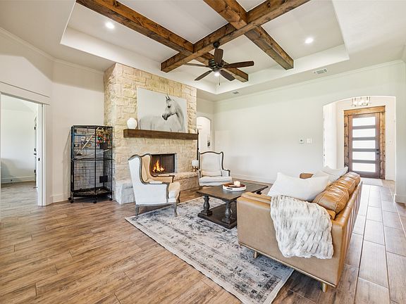 This gorgeous home on a spacious one-acre lot offers the perfect blend of luxury, comfort, and function. Beautifully built and meticulously maintained, it shows like a model home and is move-in ready. From the moment you walk in, you'll appreciate the quality craftsmanship, thoughtful design, and abundance of natural light throughout the open-concept floor plan. The heart of the home is the inviting living room, featuring a high tray ceiling with wood beam coffered detail and a striking stone fireplace that adds warmth and charm. The chef’s kitchen is a dream—complete with a large island, stainless steel appliances, a farmhouse sink, granite countertops, walk-in pantry, and a sunny breakfast area that opens to the living room’s wall of windows. The tranquil primary suite is a private retreat with a spa-like ensuite bath offering a walk-in shower, garden tub, dual vanities, and walk-in closets. A versatile front office with barn doors can easily serve as a formal dining room. Outdoors, enjoy peaceful views and fresh air from the covered patio. A spacious 3-car garage provides ample storage and convenience. Don’t miss this exceptional home—schedule your showing today!