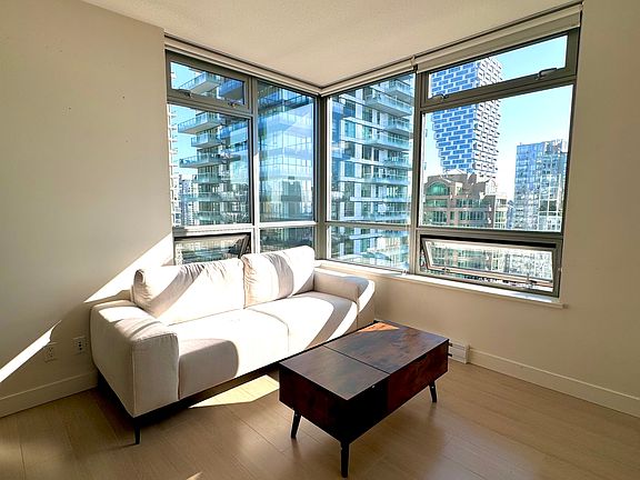 This A/C ready AVAILABLE unfurnished 2 Bedroom 1 bath + Den + Balcony home represents an extraordinary opportunity to live in sophisticated, premium condominium in a prime Downtown Vancouver location just steps from the famous Seawall. It is currently furnished with one queen size bed, one b twin size bed, night stands, high top dining table, barstools, bed, coffee table, TV stand and a sofa. Includes 1 u/g parking.