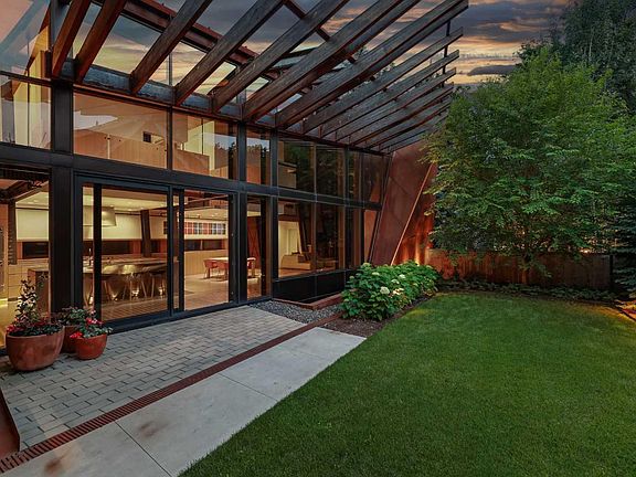 The lower level offers a glassed-in wine cellar, guest suite, wet bar, and custom storage for an art collection.