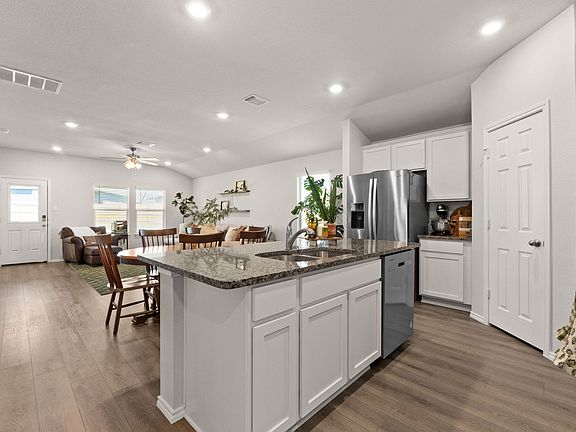 Recessed lightingAmple natural lightGranite countertopsVaulted ceilingsSpacious kitchenNeutral color paletteCeiling fan