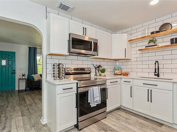 Pet friendly home features updated kitchen, bathroom and flooring and includes a washer and dryer.