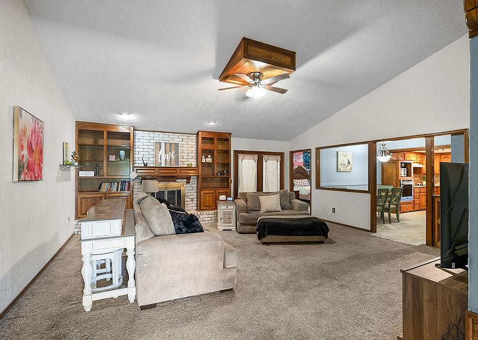 The semi-open floor plan highlights a large living area with a charming brick gas fireplace, framed by custom built-ins that add both style and function. The kitchen provides an abundance of cabinet space and is designed for easy flow, making it comfortable to cook and gather without feeling crowded. Adjacent to the kitchen, the dining area includes a built-in desk with additional storage, perfect for staying organized.