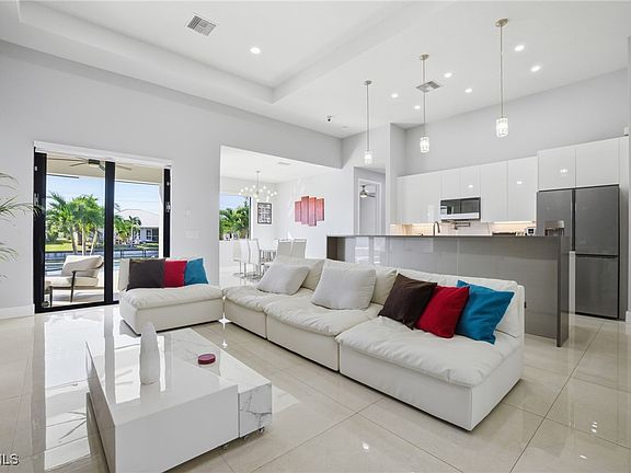 Step inside to find a bright, open-concept layout with soaring ceilings, modern finishes, and plenty of natural light. The kitchen features sleek cabinetry, stainless steel appliances, and a spacious island—ideal for both cooking and entertaining. The living area flows seamlessly to the expansive covered lanai and oversized patio, complete with a sparkling pool and room for lounging or dining outdoors while taking in the serene canal views.
