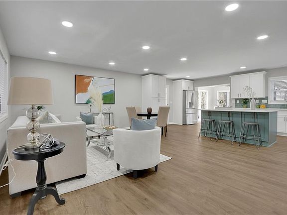 - Features: Breakfast Bar, Breakfast Room, Cabinets White, Eat-in Kitchen, Kitchen Island, Stone Counters, View to Family Room