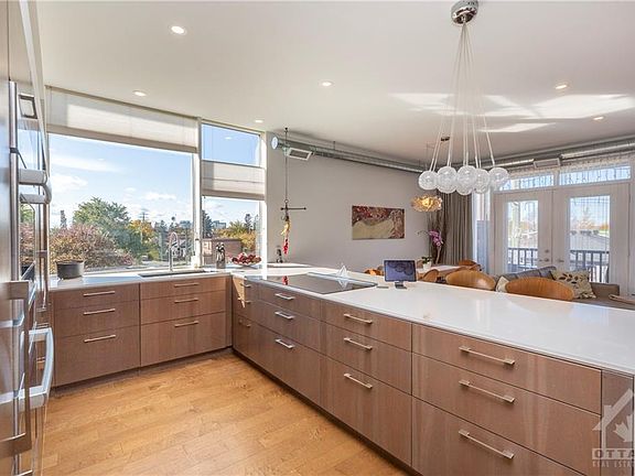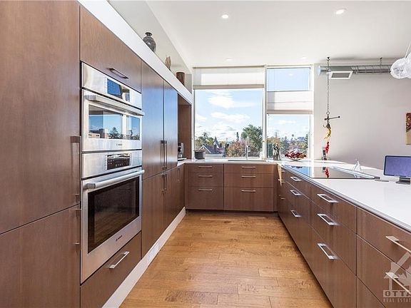 No further showings Modern, Spacious, Bright, Luxurious, Penthouse Condo: 2 bedrm, 2 bathrm, 9' ceilings, large open flr plan, plenty of large south/west facing windows that capture amazing sunsets & sunlight. Kitchen boasts flush wall mount backlit cabinetry, quartz waterfall countertops verging onto full height windows, induction cooktop, paneled appliances, and a double fridge. Bathrms w/ Hansgrohe, Duravit, Ammara fixtures & quartz. Main bathrm w/ heated flrs. Other features include upgraded lighting throughout, balcony with your own private gas BBQ; Built-in home office cabinetry offers major storage space, custom Norman blinds, engineered hardwd flrs throughout; primary bedroom decorated with a feature stone wall, walk-in closet; oversized washer & dryer w/ additional storage, covered parking space. Check out this 1000+ sqft piece of heaven, within walking distance: parks, Experimental farm, transit, Westgate mall.