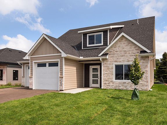 This New Construction Completed Home is the Walker II plan at Fairway Greens North in Isanti. This 1 1/2 Story offers a 8x12 Loft area upstairs for an extra living space. This home features custom cabinets with soft close closures, Gas Slide In range and overhead hood fan. Vaulted ceilings, Upstairs bath and bedroom, Main floor Primary bath, custom tile and walk in closet. Garage is oversized 2 stall and storage access in rafters. Come take a look at this unique home that has many custom features. Full sod and Irrigation! We have a similar 3br 2 bath Brynlee Model starting price of 365000.00 1 level