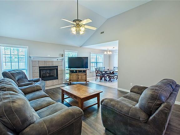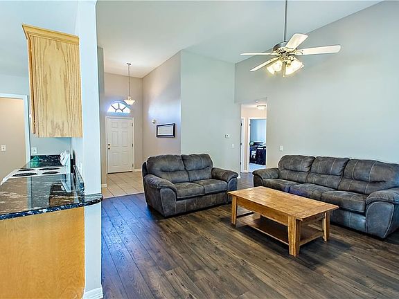 Amazing home w/professional landscaping & in a quiet neighborhood! 14 ft ceilings, new flooring w/lifetime warranty & 3cm granite countertops throughout. KIT w/lots of counter space, bar & eat-in area. Spacious MBR fts neutral colors & trayed ceilings. MBA has large countertop & mirror, whirlpool tub & separate walk-in shower. Oversized garage w/10x11 workshop! Home also has security system w/2 cameras for added peace of mind! Huge backyrd w/covered patio are perfect for grilling & entertaining friends