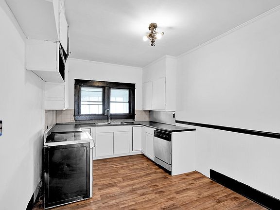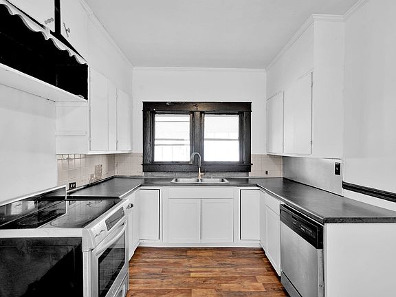 Sleek black-and-white modern themeFresh paintLower kitchen cabinetsKitchen appliancesPartially fenced-in areaCovered porchTall ceilings