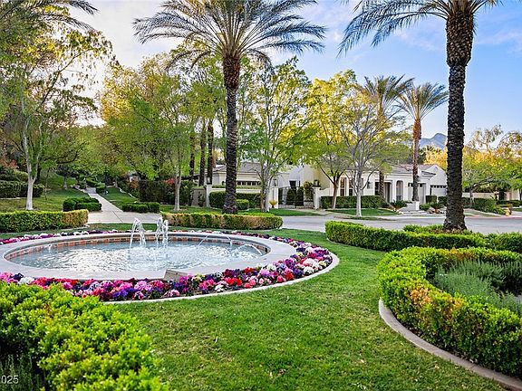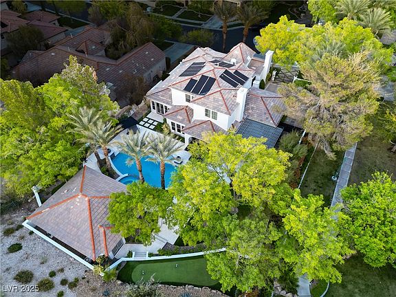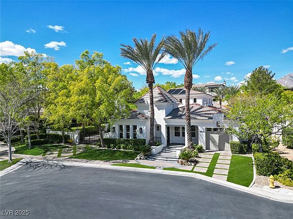 A rare opportunity to own nearly half an acre of private, double-gated luxury in one of Summerlin’s most coveted enclaves. Introducing a one-of-a-kind estate at the end of a cul-de-sac in the guard-gated community of The Vineyards. Privately set behind its own custom iron gate, this timeless residence offers rare seclusion & a detached guest house for elevated hospitality. Inside you're welcomed by a vaulted wood dome ceiling & custom mural painted by a renowned local artist. Enjoy the ambiance of multiple fireplaces, floor-to-ceiling sliders & French doors that create a seamless indoor/outdoor living experience. The resort-style backyard is a showpiece featuring lush landscaping, a newly refinished Pebble Tec pool, ambient lighting, putting green, outdoor dining with a 42" grill, and fire pit. At the heart of the home is a chef’s kitchen with European appliances, ceiling-height cabinetry & oversized island. Complete with a temperature controlled wine room & a main level primary suite.