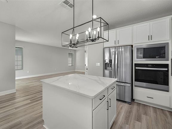 Tall white cabinetsElegant quartz countertopsOpen layoutCharming front porchCovered back patioSpacious kitchenPrimary suite