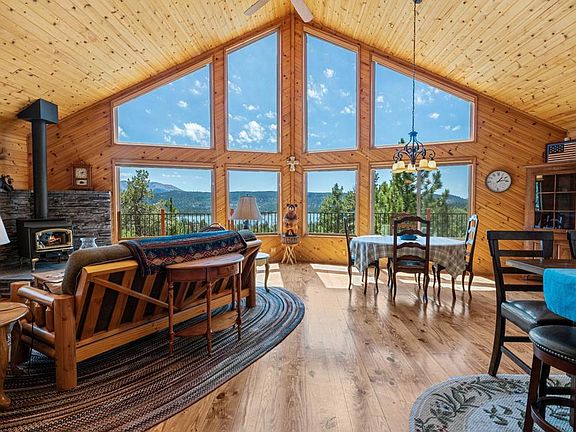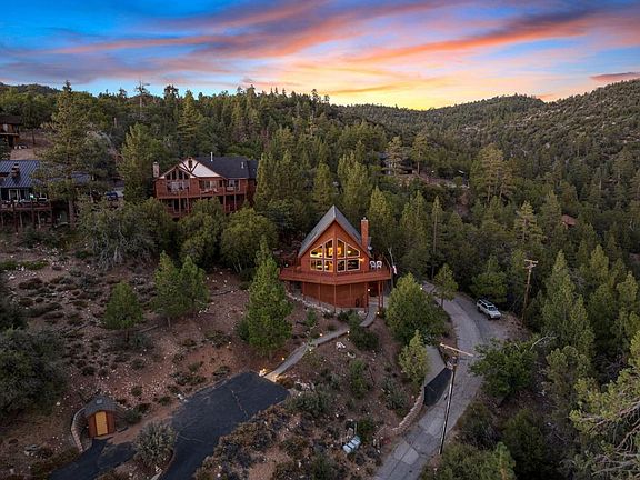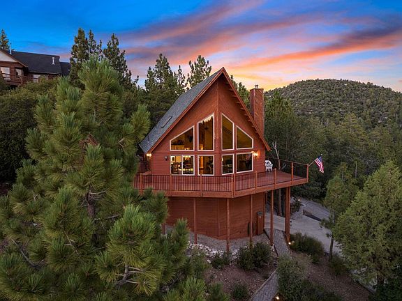 Absolutely Stunning Views. Some of the best lake, forest and valley views you will ever encounter in a mountain cabin. Located at the end of the road, deep in the woods and surrounded by trees. On top of the hillside, above everything. Huge almost 30,000 square foot lot. Two lots, one comes with a well and a separate large parking pad, great for RV and boat storage. High ceilings with floor to ceiling windows to let in all those gorgeous views. Views from every window. Don't just concentrate on the lake, the forest views are just as spectacular. Light and bright with a wide open floor plan. You'll love how the kitchen opens up to the grand living room. Newly redone wrap around decks railings. New vinyl dual pane windows (Milgard Low E). Real wood floors. Whole house central air-conditioning and furnace! Ceiling fans and cedar closets with built in cedar dressers. Heated bathroom floors. Newer marble and cherry vanities. Efficient Lopi wood stove. Remote Wi-Fi smart thermostat. Oversized one car garage. Fully functional trapezoid blinds. Fantastic, private backyard with large deck and a waterfall fountain. Wood shed. Build on the second lot and have two cabins or keep one and sell the other. A dream come true for anyone who has ever dreamed of a real mountain home to call their own.