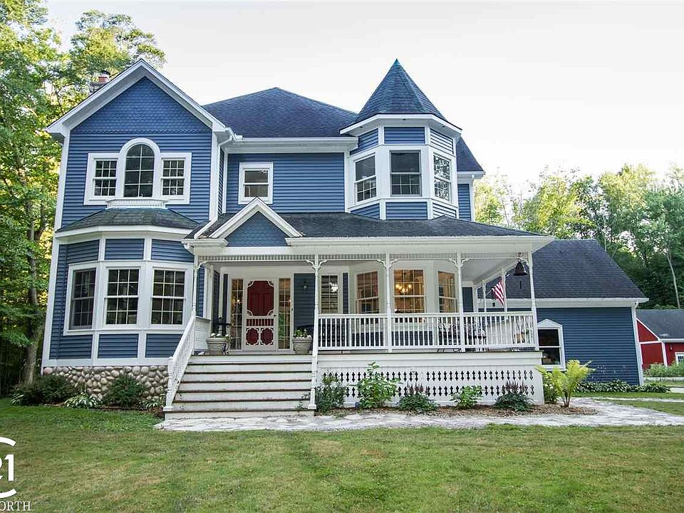 Charming, Custom built 1997 Victorian with replicated 19th century detail on 4.5 wooded acres in Bruce Twp. 3 Bedrooms and 2 and a half baths with additional half bath in finished lower lever. Extensive use of beautiful red oak flooring throughout the home and ceramic tile in the kitchen & the spacious 1st floor laundry room. This stunning home features 10 ft ceilings on the main level and 9 ft ceilings on the second floor, abundant use of heavy detailed trim on all windows, doors & floors as well as incredible wainscoting in various rooms. Beautiful Master Bedroom with fireplace & French doors leading to covered porch. Updated Master bath features large tub surrounded by a beautiful bay window, with a separate shower. The Living Room also features a stunning fireplace with new insert (1 year old) & French doors to a covered porch. The pole barn is almost 2,000 sq ft, heated & fully insulated, has two 12x9 overhead doors and one 16x9.