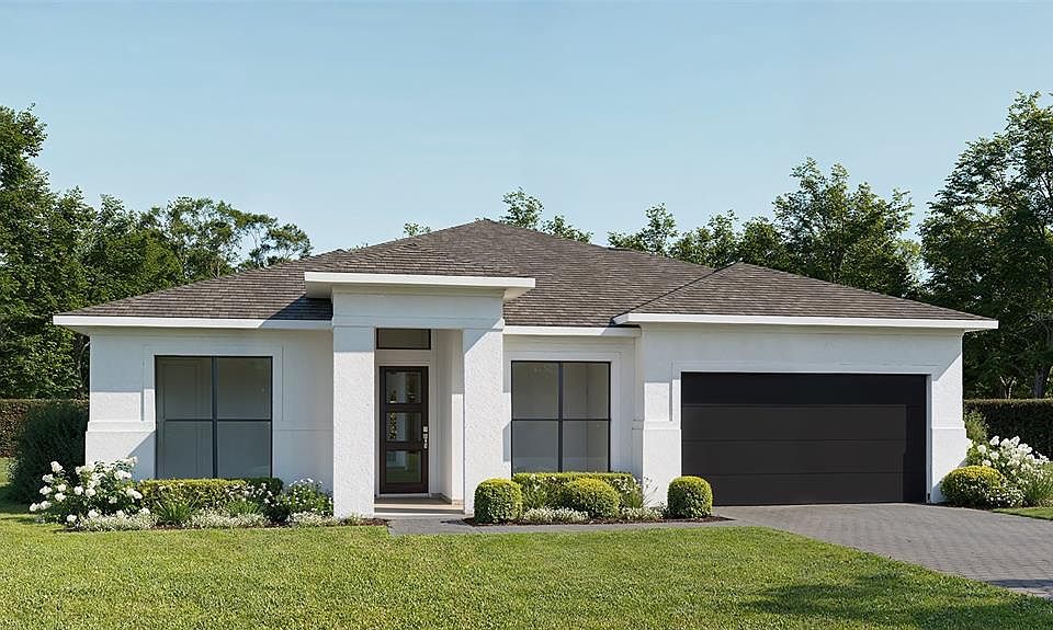 Under Construction. The front porch opens into the extended entryway lined with a 12-foot tray ceiling. French doors open into the home office that overlooks the front yard. Two secondary bedrooms are off the main hallway and feature walk-in closets and a shared bathroom. You pass a bonus flex room with storage space before entering the heart of the home. The dining area with three large windows connects to the open concept family room boasting ample natural light from the sliding glass door. The kitchen hosts an island with built-in seating and corner walk-in pantry. The morning area is lit up by the corner wall of windows and allows access to the backyard covered lanai. A half-bathroom is off the kitchen. The primary bedroom boasts a wall of windows. Double doors lead into the primary bathroom which hosts dual vanities, a freestanding tub, glass enclosed shower, and two walk-in closets. A private guest suite with full bathroom is located off a shared hallway with the laundry room. The drop zone is just off the three-car garage.