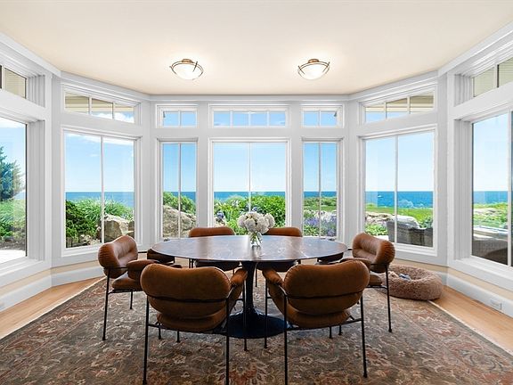 A magical ocean front retreat designed by Epstein Joslin Architects (Shalin Liu performance center) commands a prominent perch on sought after Atlantic Road. Sweeping ocean views combined with grandeur and warmth will take your breath away. The first floor, with its open floor plan, combines a grand living room with fireplace and wet bar, dining area, fabulous breakfast nook and chef's kitchen. The second floor is host to two spacious bedroom suites with expansive ocean views. Most notable is the Primary Suite with two large dressing room closets, fireplace, 2-person rain shower and Jack and Jill sitting room. The third-floor office/bedroom is simply awe inspiring, with panoramic ocean and golf course views in every direction. Office/guest house above garage is private and luxurious with golf course views. Enchanting outdoor areas from the patio overlooking the ocean, custom gazebo surrounded by gardens to the spacious lawn. Bonus feature: Wide entry elevator access from every floor.
