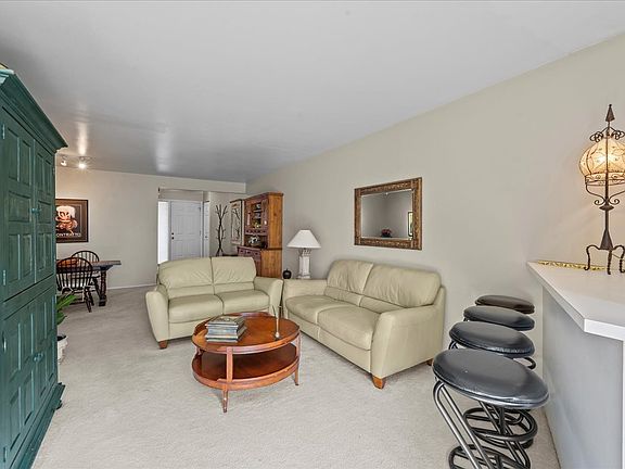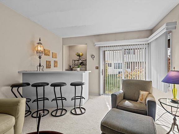 Ground level ranch style living in the most sought after model in Hidden Lake Village. Wonderful 2 bedroom, 2 full bathrooms with attached garage! Enjoy the private courtyard entry with beautiful perennials, or the direct entrance to your unit from the attached one car garage! Walk in to an expansive, light bright living room and combination dining room; a great entertaining space replete with a custom built bar that adds extra serving space, work space and storage that guests and family will enjoy. Sliding glass doors from the living room open to a private newer patio space that has ample room for patio furniture and is a great way to enjoy the three outdoor seasons. The kitchen overlooks the private front courtyard and offers a laundry and utility room between it and the garage entrance. A large primary bedroom has two banks of closets and a private bath with double sinks. The second bedroom, currently used as an office, is across the hall from the second full bathroom! This unit should not be missed!
