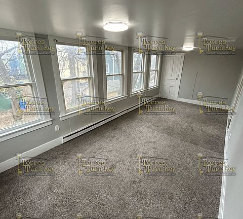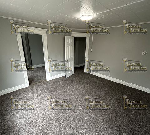 Spacious and bright upstairs apartment featuring large windows, fresh gray-painted walls, and plush dark carpeting. This unit includes multiple rooms with vintage-style trim and ample natural light. The layout offers a comfortable living space with a cozy atmosphere. Located in a quiet neighborhood, it's perfect for anyone seeking a peaceful yet convenient home. Close to local amenities and public transportation.