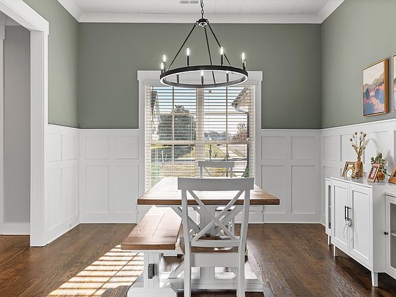 This meticulously designed home welcomes you with its charming covered front porch, setting the tone for a residence that combines elegance and comfort. The living room features a stacked stone gas fireplace and a beautifully detailed tray ceiling, creating a cozy yet sophisticated atmosphere. Abundant natural light floods the home, enhancing the bright and airy feel throughout.