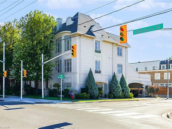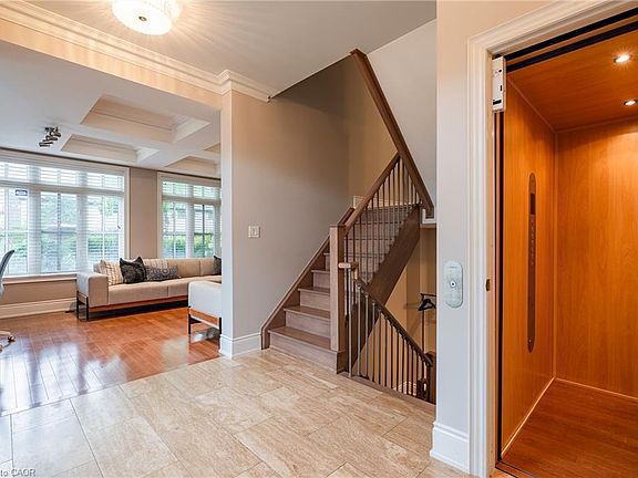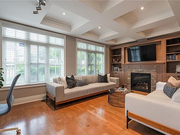 Welcome to Village West a boutique enclave of upscale freehold townhomes set in Oakville’s downtown core. This rare end-unit feels more like a New York loft than a traditional townhouse. With soaring 12-foot ceilings and loaded with huge windows throughout, the interior is defined by its sense of volume, openness, and sunlight. Where every room feels generous in scale and effortlessly connected. From the moment you step inside, you’ll notice the proportions: expansive principal rooms, wide hallways, tall door thresholds, and wide staircases with oversized landings. The dining room is truly grand, while the adjoining kitchen and family room are framed by a dramatic, sky-high coffered ceiling. The kitchen has been fully renovated, featuring high-end appliances, sleek finishes, and a layout designed for both everyday living and entertaining. Hardwood flooring runs throughout the home, complemented by two fireplaces and the convenience of a private elevator to every level. The double-car garage is oversized, providing not only secure parking but also ample room for storage. On the main level, a flexible office/sitting room overlooks the landscaped front and side gardens, where mature plantings and trees create privacy and a lush green outlook. On the third level, two very large bedrooms, each with its own ensuite, are generously proportioned making them a flexible space for various needs. The outdoor living is equally impressive. A 650 sq ft south-facing terrace offers a private retreat with enough room to entertain on a large scale or simply unwind in peace. The lower level extends the living space even further, perfect for a home gym, office, media room, or whatever suits your needs best. Village West is as practical as it is refined. This enclave is beautifully maintained, with a welcoming atmosphere and neighbours who take pride in their homes. All this and just steps to downtown Oakville’s shops, dining and the lakefront parks that make this location so desirable.