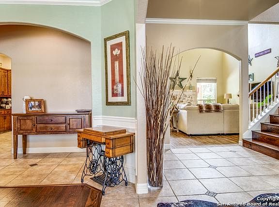 Absolutely stunning home in gated neighborhood of Sonoma Ranch. 4078 sq ft, 4 BR/3 full baths, 2 half baths, 3-car garage & resort-like backyard! Arched entries, ornate ceramic tile, wood floors & beautiful rock fireplace greet you as you enter this magnificent home. Kitchen features granite counters, breakfast bar, island, gas cooking, abundance of cabinets. Elegant, separate formal dining rm w/ coffered ceiling. Crown molding throughout. Huge MBR Suite on 1st Floor w/ garden tub, separate shower, double vanities & custom walk-in closet. Level 2 offers 3 BRs/2 BA & large gameroom. Manicured lawn & landscaping surround a sparkling pool w/adjacent spa, cabana bath, custom-built wood deck & fire pit. Covered patio & privacy fence complete this perfect oasis. Conveniently located near UTSA, La Cantera & Fiesta Texas.